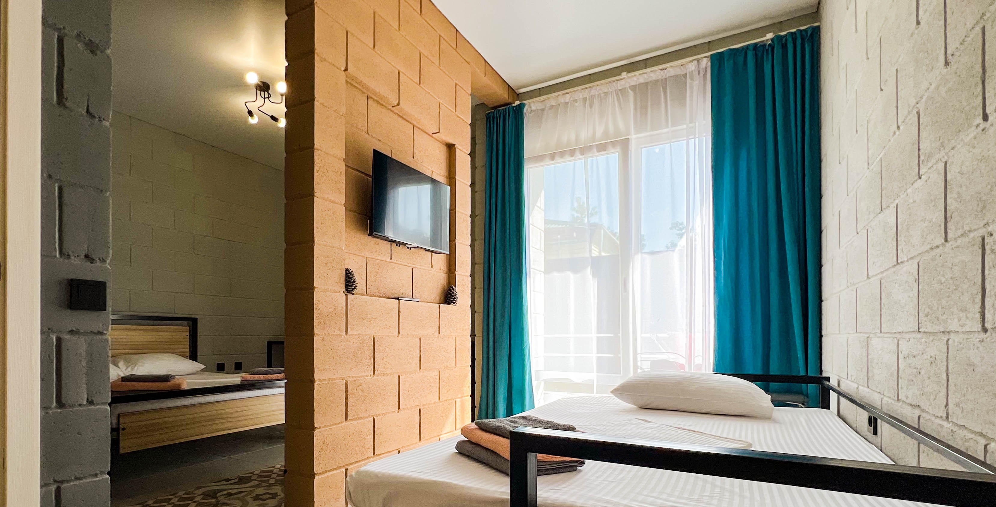 Спальные места: Мебель: кровать двуспальная, шкаф для одежды, раскладной диван (2 доп. места)